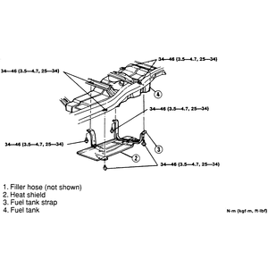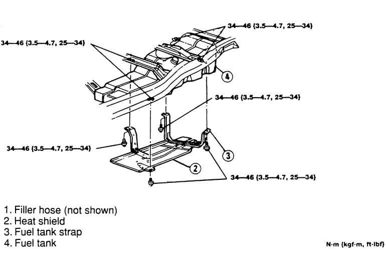 - Tighten the fuel tank strap retaining nuts or bolts to 25–34 ft. lbs.