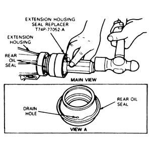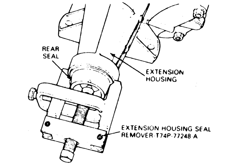 - Remove the extension housing seal using tool T74P-77248-A or equivalent,