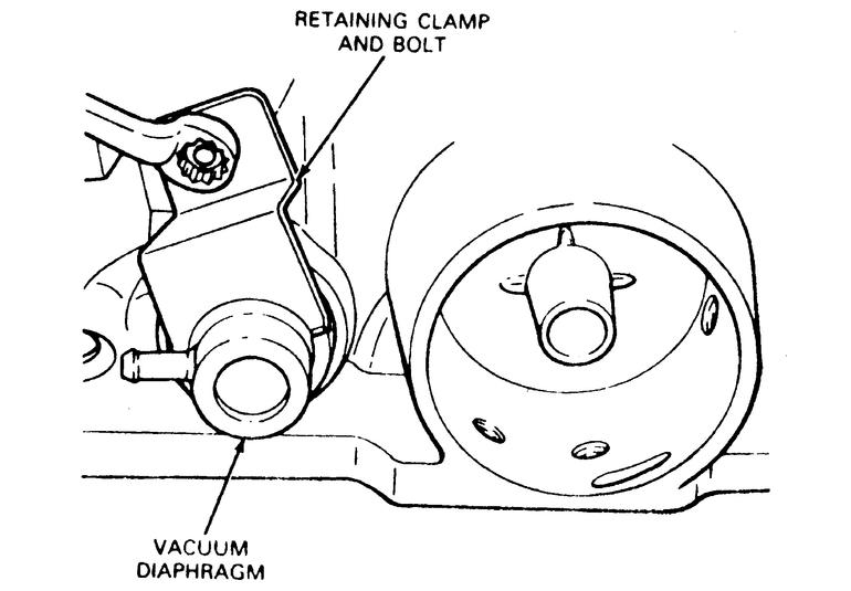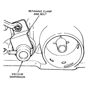 | Fig. 1: Remove the vacuum diaphragm retaining clamp and bolt, then pull the diaphragm out of the transmission |