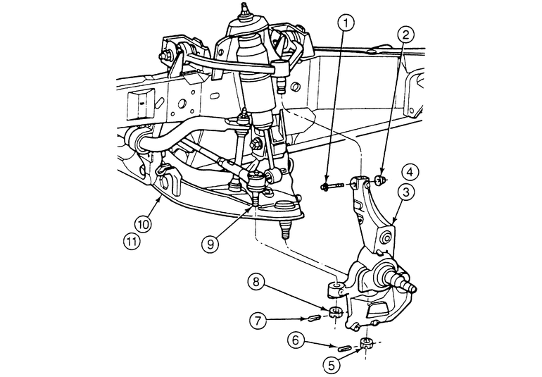 - Remove the upper ball joint cotter pin and nut. Loosen the lower ball joint