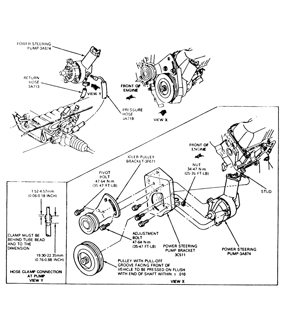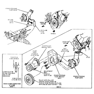 NOTE: Fore and aft location of the pulley on the power steering pump shaft is critical. Incorrect belt alignment may cause belt squeal or chirp. Be sure that the pull off groove on the pulley is facing front and flush with the end of the shaft ± 0.010 in. (0.25mm).