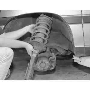 Fig. 4: After separating the strut from the knuckle, support the knuckle with a strong piece of wire to prevent possible stress damage to the rubber brake hose