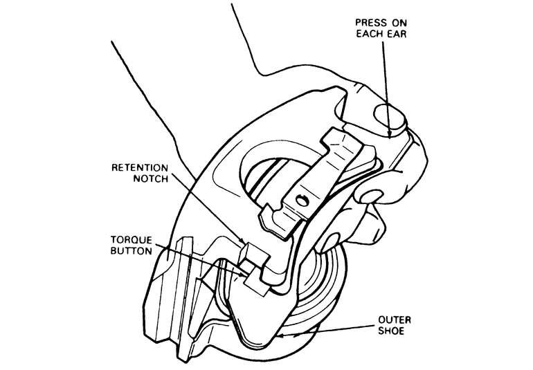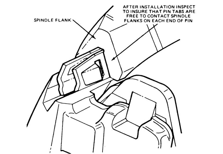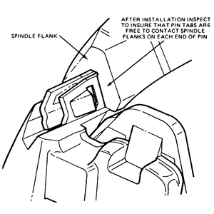 | Fig. 13: After installing the pins, ensure that the tangs are free to contact either side of the caliper mount |