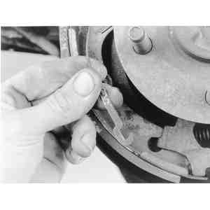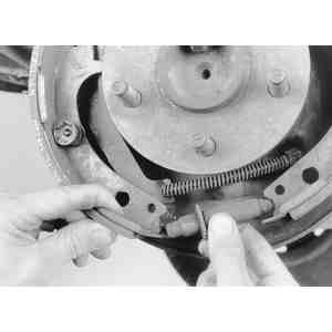 | Fig. 13: Remove the primary (front) brake shoe from