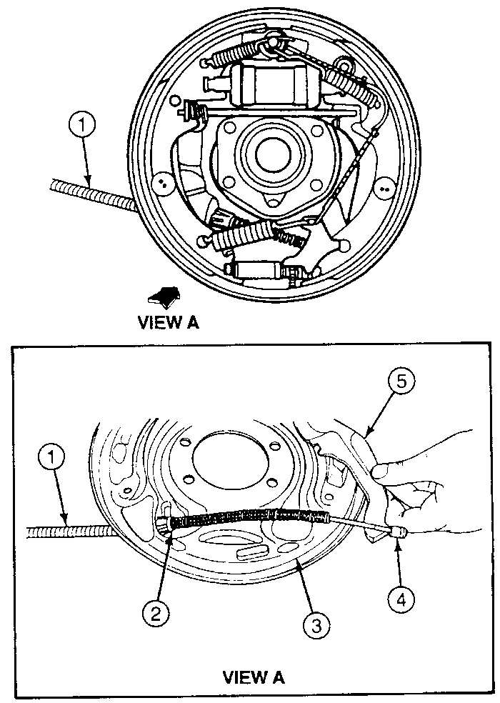 through the hole in the brake backing plate. Draw the cable retainer out of