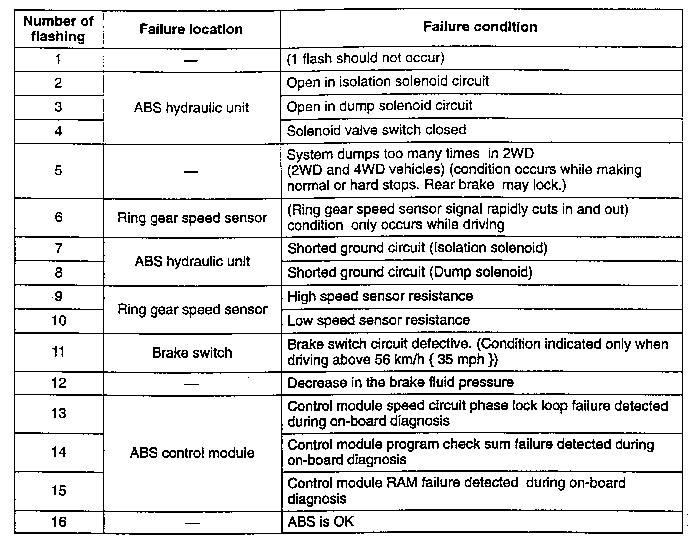 The RABS module performs system tests and self-tests during startup and normal operation. The valve, sensor and fluid level circuits are monitored for proper operation. If a fault is found, the RABS will be deactivated and the ABS light will be lit until the ignition is turned OFF. When the light is lit, the diagnostic flashout code may be obtained. Under normal operation, the light will stay on for about 2 seconds while the ignition switch is in the ON position and will go out shortly after. A flash code may be obtained only when the light is ON. Before reading the code, drive the vehicle to a level area and place the shift lever in the PARK or NEUTRAL position. Keep the vehicle ignition ON.