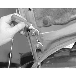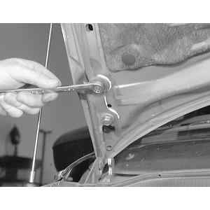 helper, loosen and remove the four hood-to-hinge mounting bolts