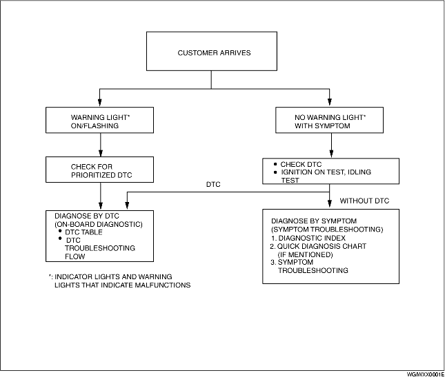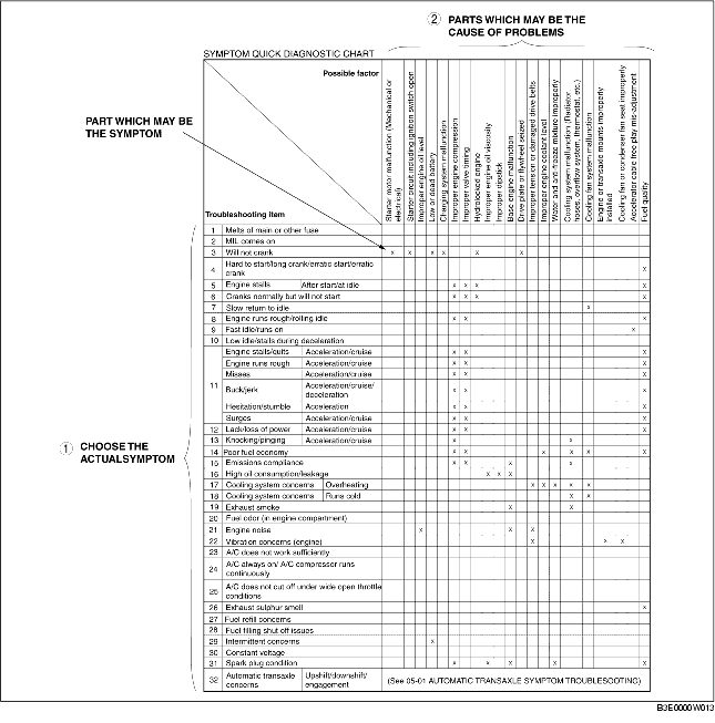 • The appropriate diagnostic inspection relating to malfunction cause as specified by the symptoms can be selected by looking down the diagnostic inspection column of the chart.
