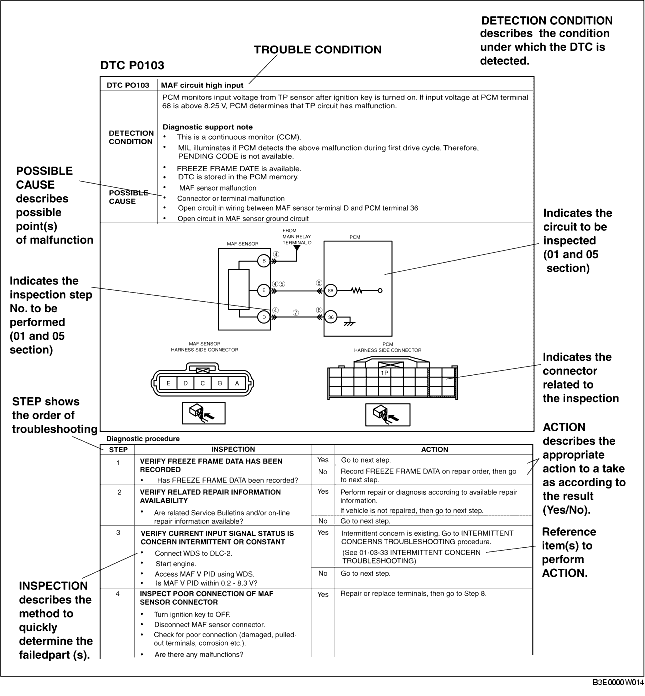 • DTC troubleshooting flow shows diagnostic procedures, inspection methods, and proper action to take for each DTC.