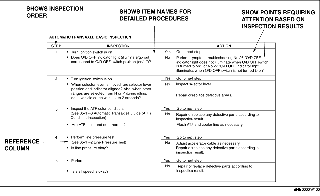 • The reference column lists the location of the detailed procedure for each basic inspection.