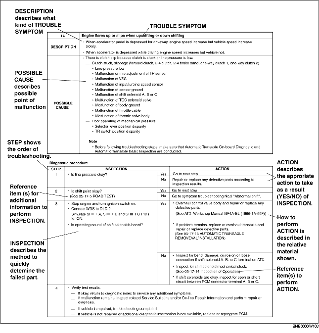 • Symptom troubleshooting shows diagnostic procedures, inspection methods, and proper action to take for each trouble symptom.