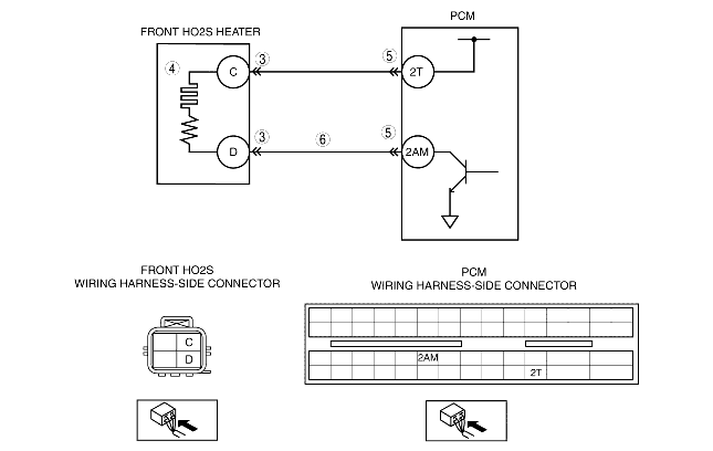 • Measure the voltage between front HO2S terminal D (wiring harness-side) and body GND.