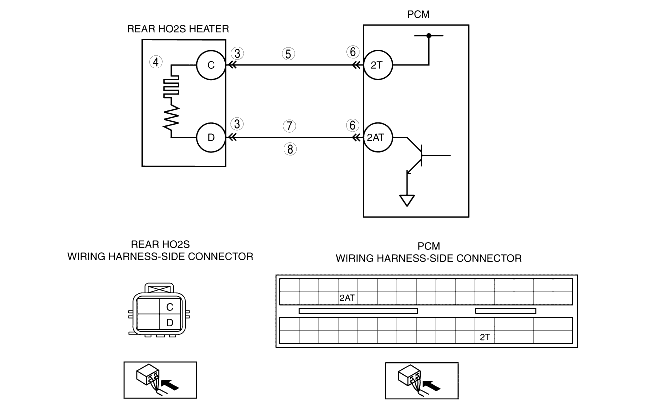 • Inspect for continuity between rear HO2S terminal D (wiring harness-side) and PCM terminal 2AT (wiring harness-side).