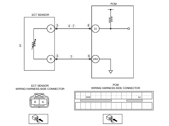 • Measure the voltage between ECT sensor terminal A (wiring harness-side) and body GND.