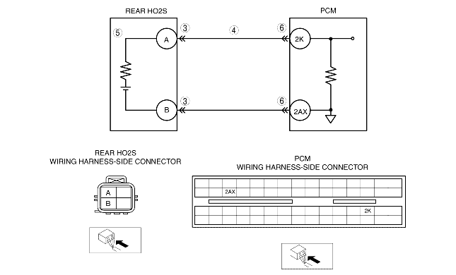 • Measure the voltage between rear HO2S terminal A (wiring harness-side) and body GND.