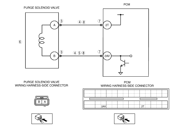 • Measure the voltage between purge solenoid valve terminal B (wiring harness-side) and body GND.