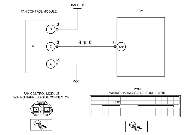 • Inspect for continuity between fan control module terminal C (wiring harness-side) and PCM terminal 1AP (wiring harness-side).