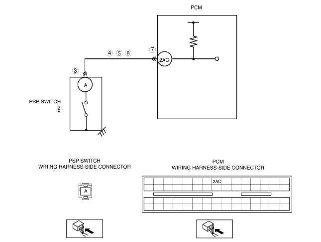 • Inspect for continuity between PSP switch terminal A (wiring harness-side) and PCM terminal 2AC (wiring harness-side).