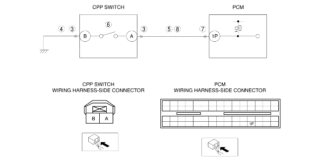 • Inspect for continuity between CPP switch terminal A (wiring harness-side) and PCM terminal 1P (wiring harness-side).