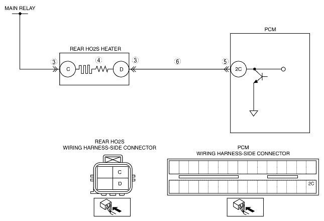 • Measure the voltage between rear HO2S terminal D (wiring harness-side) and body ground.