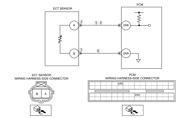 • Inspect for continuity between ECT sensor terminal A and B (wiring harness-side).