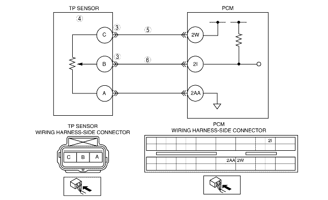 Repair or replace open circuit in wiring harness between TP sensor connector terminal C and PCM terminal 2W (wiring harness-side).