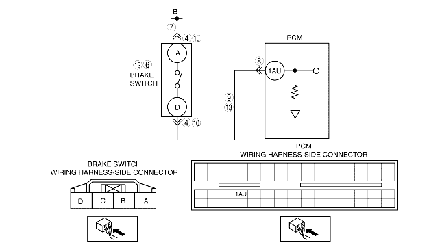 • Inspect for continuity between brake switch terminal D and PCM terminal 1AU.