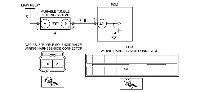 • Measure the voltage between variable tumble solenoid valve terminal A (wiring harness-side) and body ground.