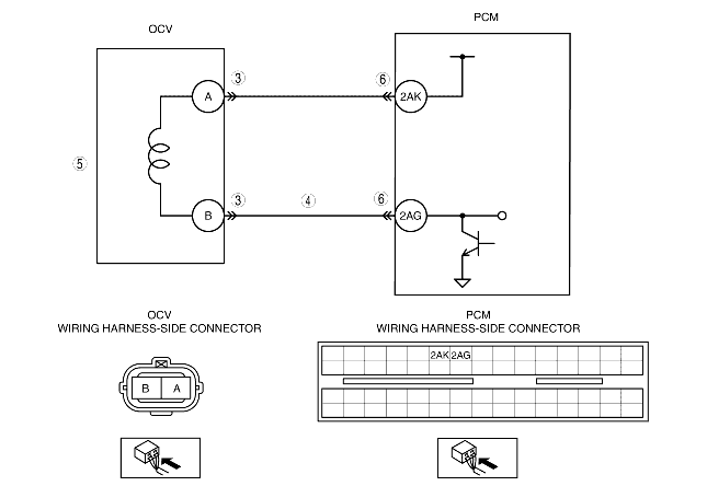 • Measure the voltage between OCV terminal B (wiring harness-side) and body GND.