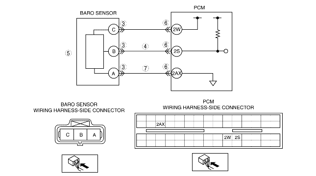 • Inspect for continuity between BARO sensor terminal A (wiring harness-side) and PCM terminal 2AX (wiring harness-side).