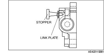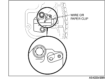 5. Insert an approx. 1.5 mm {0.06 in) thick wire or paper clip where the link plate hole and the tensioner body hole overlap to fix the link plate and lock the plunger.