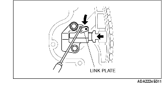1. Push down the link plate of the timing chain tensioner using a thin flathead screwdriver (precision screwdriver), and release the plunger lock.