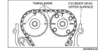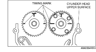 2. Align the timing marks on the camshaft sprockets so that they form a straight line in alignment with the upper horizontal surface of the cylinder head.