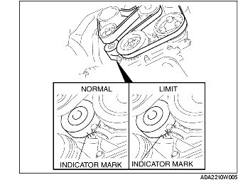 2. Verify that the drive belt auto tensioner indicator mark does not exceed the limit.