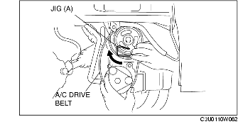 4. Install a new A/C drive belt to the A/C compressor pulley, move jig (A) upward, and then install the A/C drive belt to the crankshaft pulley.