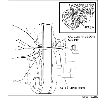 5. Install jig (B) to the A/C compressor mount as shown in the figure.