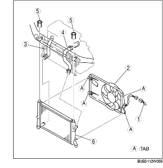 1. Unlock the lower side tab A at two points by pressing the cooling fan side tab, remove the upper side tab A at two points, then remove the cooling fan component from the radiator.