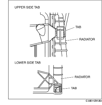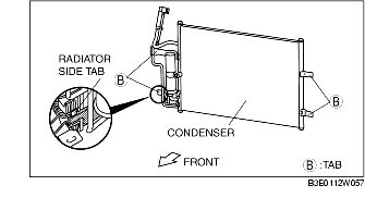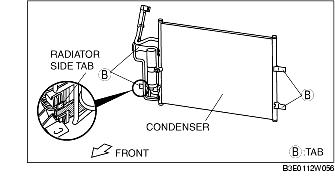 1. Install the condenser to the radiator by aligning lower side tab B with the radiator side tab, install upper tab B, then install lower side tab B.
