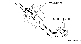 2. Move the accelerator cable in the directions of A and B, and verify that the accelerator cable play is within the specification.