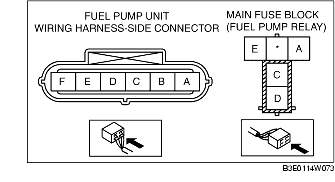 - Fuel pump unit terminal A and fuel pump relay terminal D