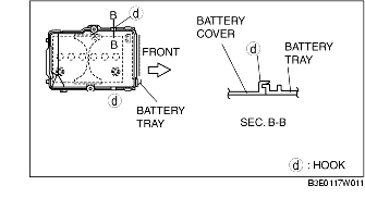2. Install with the battery cover hooks D aligned with the battery tray flange at two points.