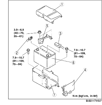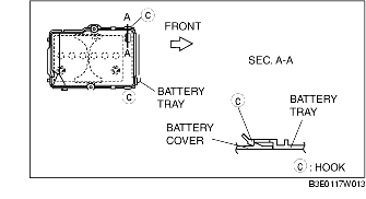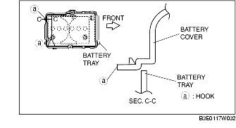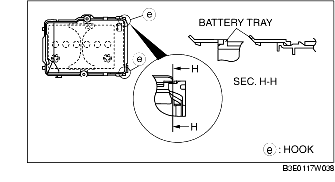 1. Assemble with the battery box hooks E aligned with the battery tray holes at two points.