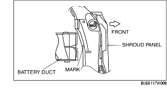 1. Match the mark of the shroud panel and notch in the battery duct, and install the battery duct to the shroud panel.
