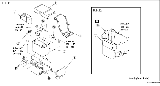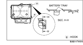 1. Assemble with the battery box hooks E aligned with the battery tray holes at two points.