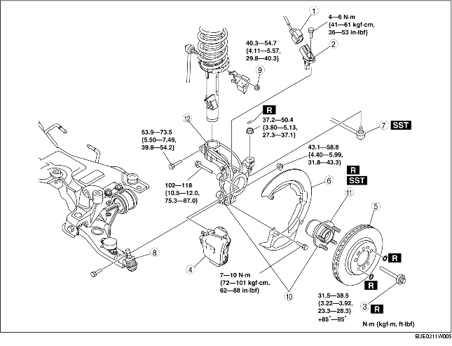 3. After installation, inspect the front wheel alignment and adjust it if necessary.
