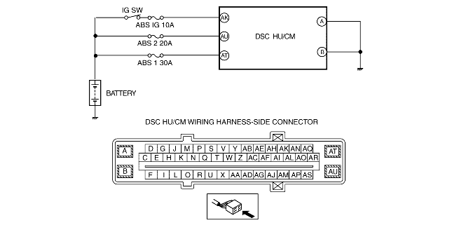 • Measure the voltage between following connector terminals of the DSC HU/CM (vehicle harness-side) and body ground: