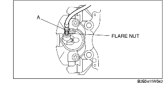 2. Tighten the flare nut while holding the brake hose at point A with a spanner or equivalent.