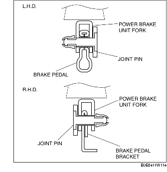 1. For L.H.D., install the new joint pin by aligning the pin holes of the brake pedal and power brake unit fork.