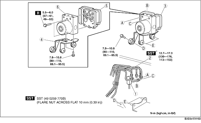 1. Align the marks made before removal and install the brake pipe into the DSC HU/CM referring to the figure.