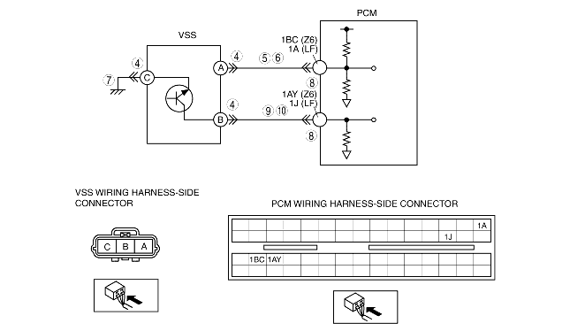 • Inspect for continuity between VSS (wiring harness-side) terminal C and ground.
